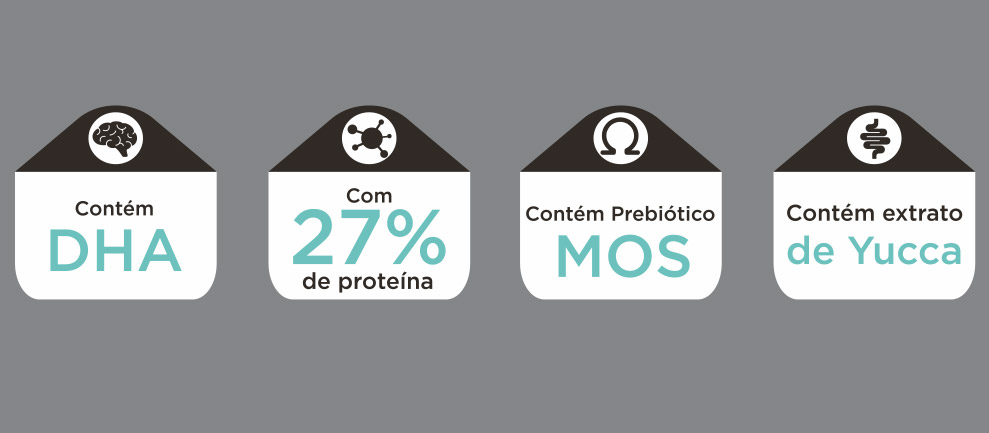 Farinha de vísceras de aves, quirera de arroz, farelo de glúten de milho 601, grão de milho1, farinha de carne e ossos de bovino, grão de sorgo, farelo de soja2, farelo de trigo3, levedura de cervejaria inativada desidratada, óleo de aves, biomassa de microalgas (Schizochytrium sp), grão de linhaça, polpa desidratada de beterraba, cloreto de sódio, cloreto de potássio, prebiótico (parede celular de levedura - mananoligossacarídeos – MOS – mín. 0,20%), extrato de yucca (mín. 0,01%), bentonita, parede celular de levedura, extrato de cardo-mariano, BHA, BHT, ácido cítrico, ácido propiônico, sorbato de potássio, hidrolisado de carne de aves e fígado de aves e suíno, cloreto de colina, biotina, vitamina A, vitamina D3, vitamina E, vitamina K3, vitamina B1, vitamina B2, vitamina B3, vitamina B5, vitamina B6, vitamina B9, vitamina B12, sulfato ferroso monohidratado, sulfato de cobre pentahidratado, sulfato de manganês monohidratado, sulfato de zinco monohidratado, iodato de cálcio, selenito de sódio.