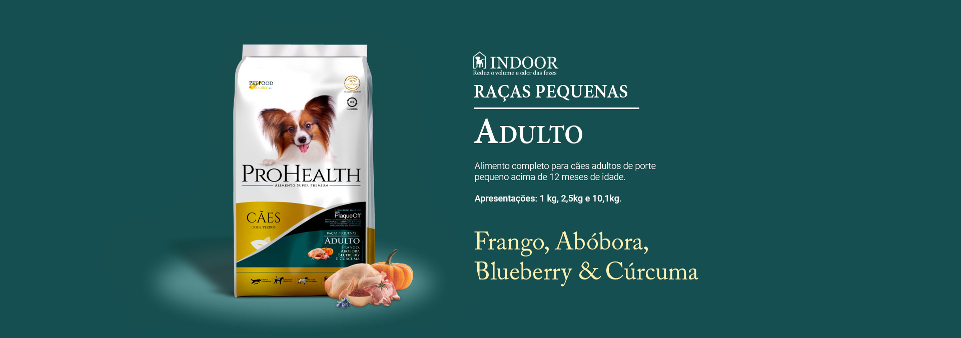 Farinha de vísceras de aves, quirera de arroz, farinha de torresmo, óleo de aves, farelo de trigo, farelo de glúten de milho - sem transgênico, hidrolisado de fígado de aves e suínos, farinha de batata doce (1%), óleo de salmão, farinha de alga parda (ascophyllum nodosum - 0,4% - Plaque Off®), polpa de beterraba, prebiótico ( MOS - Mananoligossacarídeo), cloreto de potássio, cloreto de colina, levedura inativada de cervejaria desidratada (Saccharomyces cerevisiae), cúrcuma (0,075%), abóbora desidratada (0,075%), mirtilo (blueberry - 0,075%), DL- metionina, zinco aminoácido quelato, sulfato de glicosamina (0,05%), extrato de Yucca, sulfato de condroitina (0,03%), selênio aminoácido quelato, cloreto de sódio (sal comum), biotina, vitamina A, vitamina D3, vitamina E, vitamina C, vitamina K3, vitamina B1, vitamina B2, vitamina B6, vitamina B12, niacina, ácido pantotênico, ácido fólico, sulfato de ferro, sulfato de cobre, monóxido de manganês, sulfato de zinco, iodato de cálcio, selenito de sódio, aditivo antioxidante (extrato de alecrim e tocoferol), aditivo adsorvente de micotoxinas (aluminossilicato de cálcio e sódio), aditivo conservante (ácido propiônico).