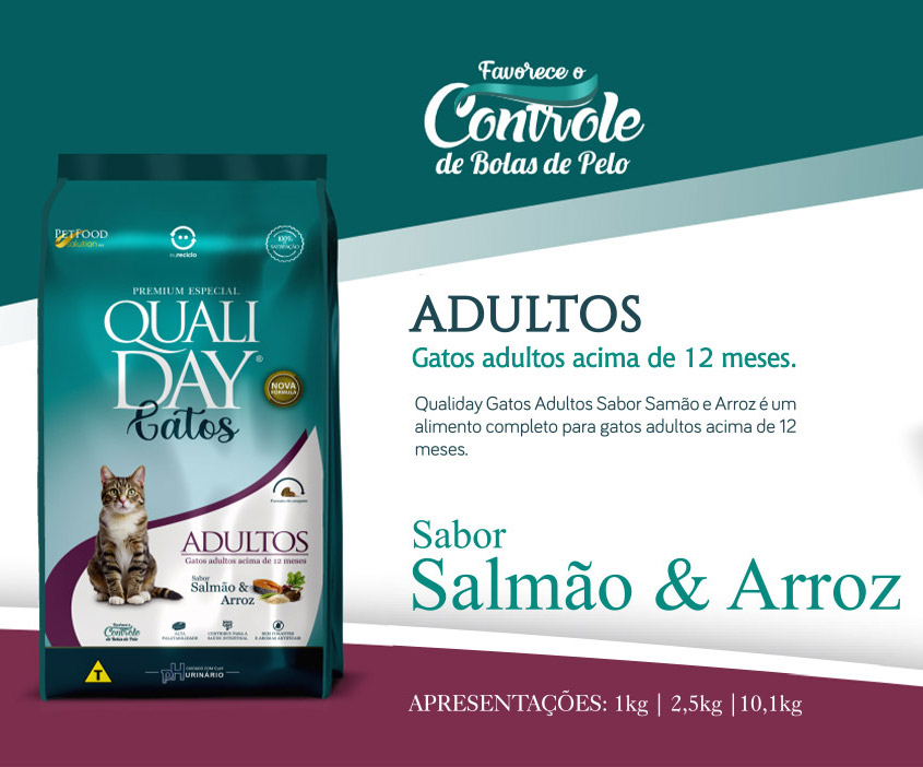Servir Qualiday Gatos seguindo as quantidades diárias sugeridas na tabela abaixo. Recomenda-se dividir as quantidades diárias em porções, oferecidas ao longo do dia. As quantidades de alimento são orientativas, podem variar de forma individual, conforme porte, nível de atividade física e temperamento do gato.