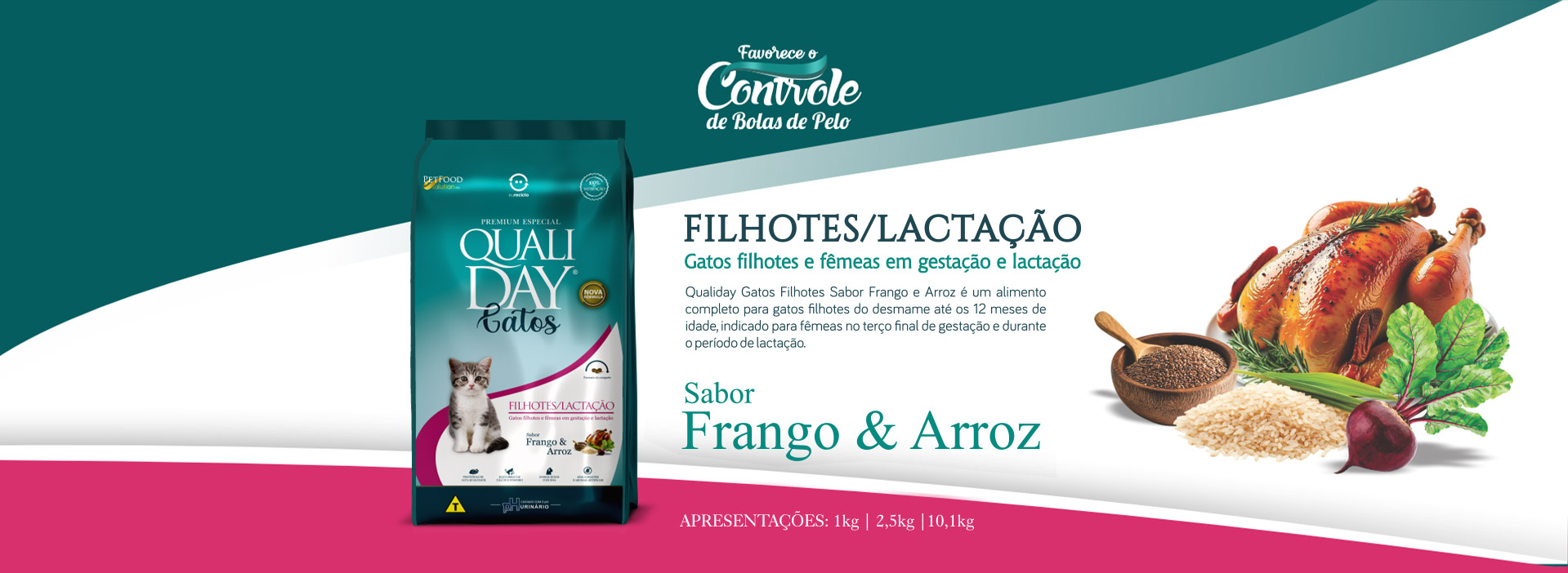 Servir Qualiday Gatos seguindo as quantidades diárias sugeridas na tabela abaixo. Recomenda-se dividir as quantidades diárias em porções, oferecidas ao longo do dia. As quantidades de alimento são orientativas, podem variar de forma individual, conforme porte, nível de atividade física e temperamento do gato. As recomendações para fêmeas no terço final de gestação e durante o período de lactação são disponibilizadas no site.