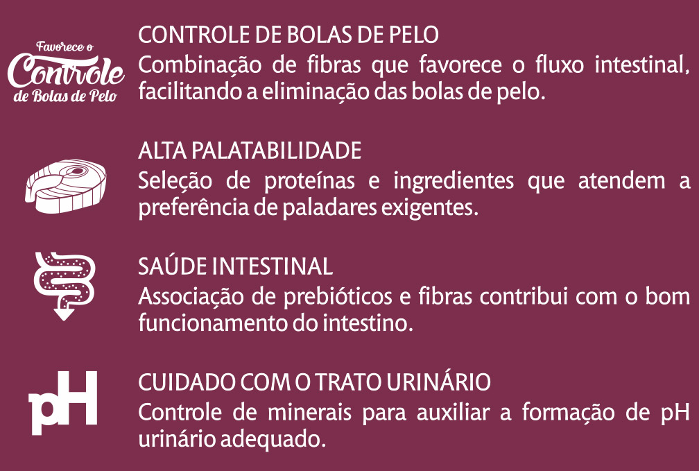 Farinha de salmão, farinha de vísceras de aves, farinha de torresmo, quirera de arroz, óleo de aves, grão de milho1, farelo de glúten de milho 601, grão de sorgo, grão de linhaça, óleo de girassol, polpa desidratada de beterraba, lignocelulose, farelo de trigo2, levedura de cervejaria inativada desidratada, prebiótico (parede celular de levedura - mananoligossacarideo – MOS – mín. 0,20%), extrato de yucca, hidrolisado de fígado de suínos, bentonita, parede celular de levedura, extrato de cardo-mariano, BHA, BHT, ácido cítrico, ácido propiônico, sorbato de potássio, DL- metionina, taurina, cloreto de sódio, cloreto de potássio, cloreto de amônio, sulfato de amônio, sulfato de manganês monohidratado, sulfato de zinco monohidratado, sulfato ferroso monohidratado, sulfato de cobre pentahidratado, iodato de cálcio, selenito de sódio, organozinco, organoselênio, vitamina A, vitamina D3, vitamina E, vitamina K3, vitamina B1, vitamina B2, vitamina B3, vitamina B5, vitamina B6, vitamina B7, vitamina B9, vitamina B12, cloreto de colina.