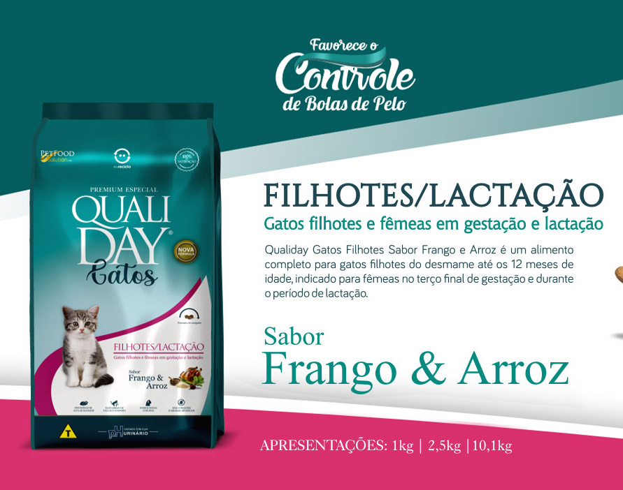 Servir Qualiday Gatos seguindo as quantidades diárias sugeridas na tabela abaixo. Recomenda-se dividir as quantidades diárias em porções, oferecidas ao longo do dia. As quantidades de alimento são orientativas, podem variar de forma individual, conforme porte, nível de atividade física e temperamento do gato. As recomendações para fêmeas no terço final de gestação e durante o período de lactação são disponibilizadas no site.